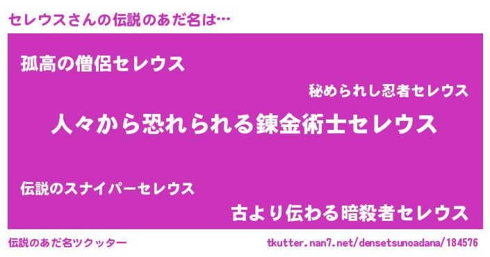 | 男性向けラノベタイトル風あだ名 | 『緋弾のセレウス』『セレウススレイヤー』 |