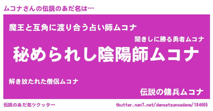 | 男性向けラノベタイトル風あだ名 | 『緋弾のムコナ』『ムコナの憂鬱』 |