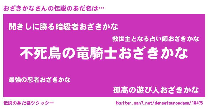 | 男性向けラノベタイトル風あだ名 | 『Re:おざきかなから始める異世界生活』 |