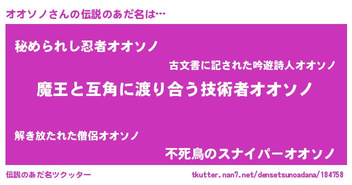 | 意味不明あだ名 | 『住所不定無職オオソノ(1歳)』 |