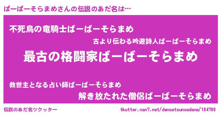 | 女子向けラノベタイトル風あだ名 | 『乙女ゲームの破滅フラグしかない悪役ばーばーそらまめに転生してしまった…』 |
