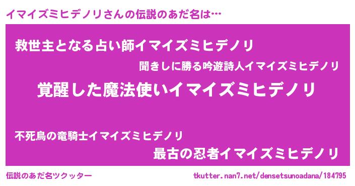 | 男性向けラノベタイトル風あだ名 | 『イマイズミヒデノリ~年齢イコール彼女いない歴の魔法使い~』 |