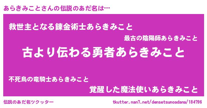 | ヒーロー風カッコイイあだ名 | 『仮面アラダー』『ネオアラキミコト』 |