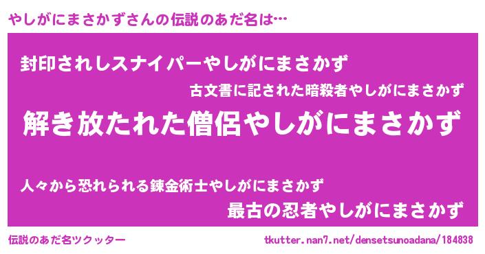 | 男性向けラノベタイトル風あだ名 | 『やしがにまさかずの嫁は女の子じゃないと思った?』 |