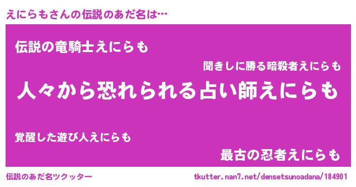 | 意味不明あだ名 | 『住所不定無職えにらも(62歳)』 |