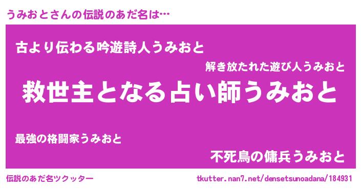 | 意味不明あだ名 | 『自称うみおと』『永久保存うみおと』 |