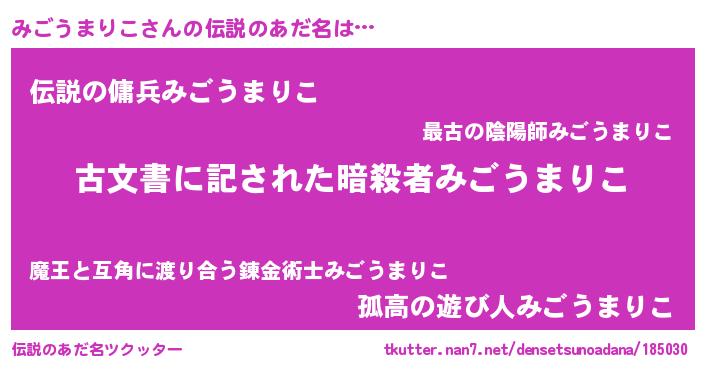 | 男性向けラノベタイトル風あだ名 | 『みごうまりこ~年齢イコール彼女いない歴の魔法使い~』 |