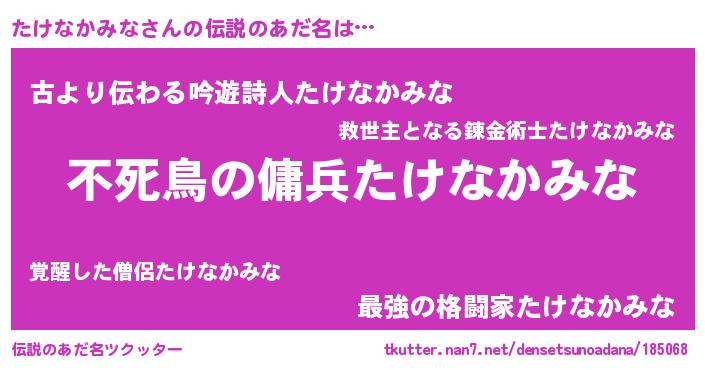| ヘコむあだ名 | 『たけにゅー』『たけなかみな(小並感)』 |