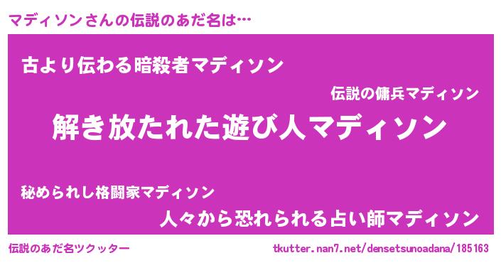| ヒーロー風カッコイイあだ名 | 『仮面マデダー』『超時空戦士マディソン』 |
