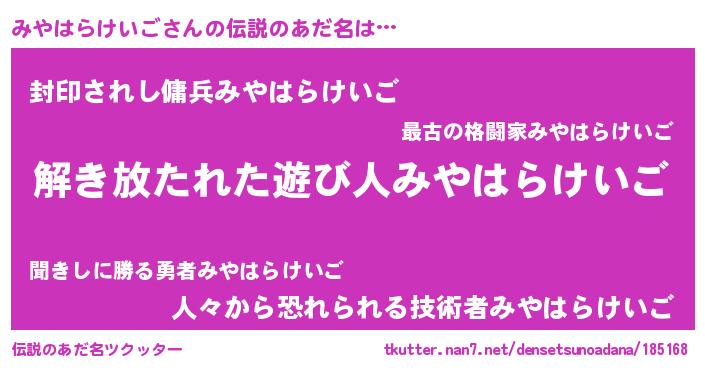 | 男性向けラノベタイトル風あだ名 | 『ダンジョンにみやはらけいごを求めるのは間違っているだろうか』 |