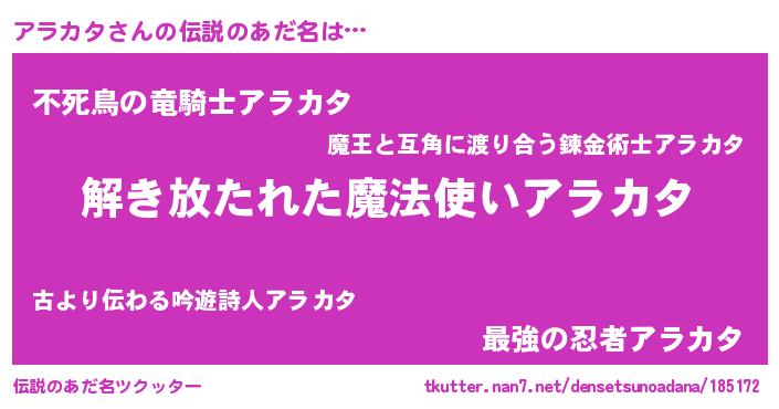 | ヒーロー風カッコイイあだ名 | 『魔戒騎士アラ』『スーパーアラカタ』 |