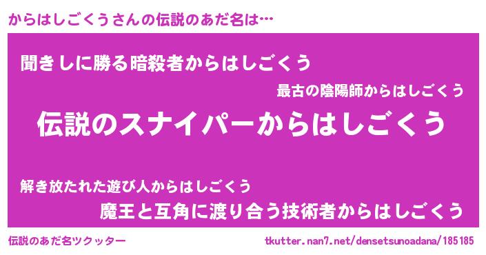 | 男性向けラノベタイトル風あだ名 | 『魔弾の王とからはしごくう』 |