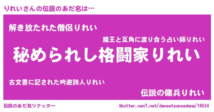 | 男性向けラノベタイトル風あだ名 | 『リレイスレイヤー』『魔弾の王とりれい』 |
