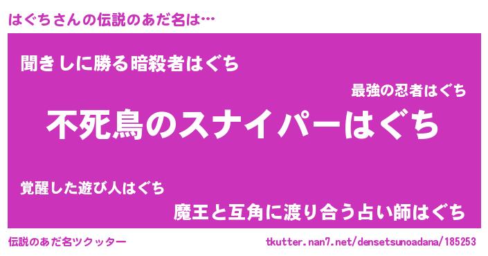 | 男性向けラノベタイトル風あだ名 | 『転生したらはぐちだった件』 |
