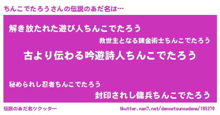 | 意味不明あだ名 | 『住所不定無職ちんこでたろう(1歳)』 |