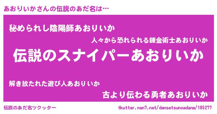 | 男性向けラノベタイトル風あだ名 | 『アオリイカスレイヤー』 |