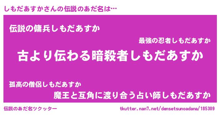 | 男性向けラノベタイトル風あだ名 | 『しもだあすかという概念が存在しない退屈な世界 』 |