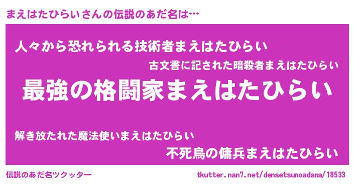 | 意味不明あだ名 | 『住所不定無職まえはたひらい(1歳)』 |