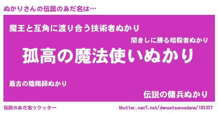 | 胡散臭い通販商品みたいなあだ名 | 『信頼と実績のサプリメント…その名も「ぬかり」』 |
