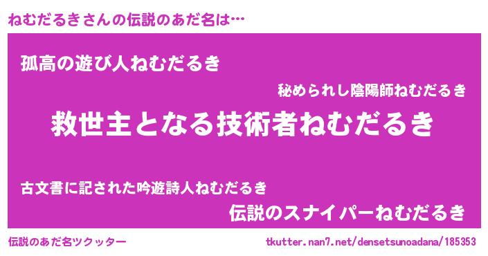 | ヒーロー風カッコイイあだ名 | 『慈愛の使者ねむだるき』『黄金騎士ネム』 |