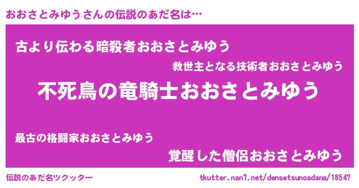 | 男性向けラノベタイトル風あだ名 | 『転生したらおおさとみゆうだった件』 |