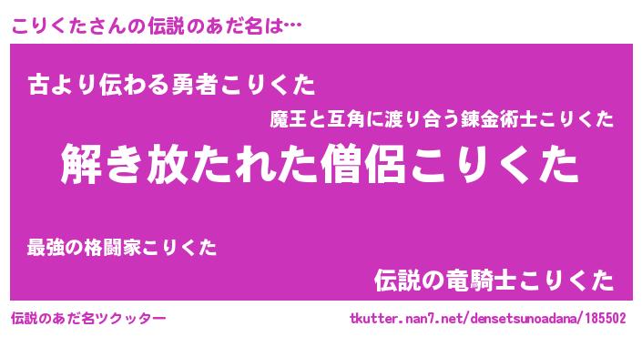 | 男性向けラノベタイトル風あだ名 | 『こりくたの嫁は女の子じゃないと思った?』 |