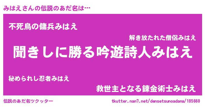 | 男性向けラノベタイトル風あだ名 | 『みはえという概念が存在しない退屈な世界 』 |