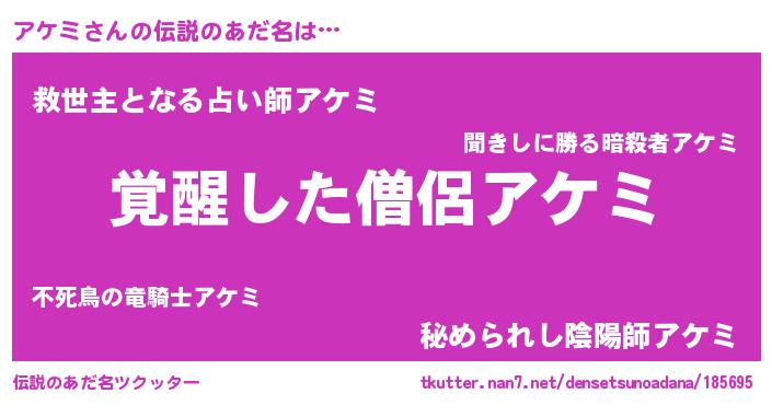 | 男性向けラノベタイトル風あだ名 | 『アケミ~年齢イコール彼女いない歴の魔法使い~』 |