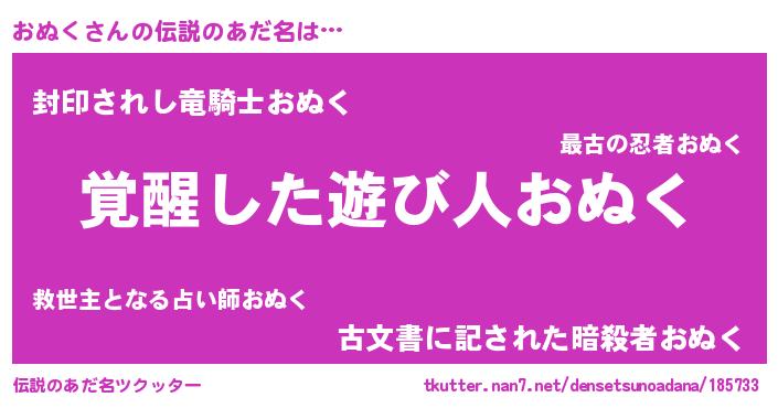 | 男性向けラノベタイトル風あだ名 | 『おぬくの嫁は女の子じゃないと思った?』 |