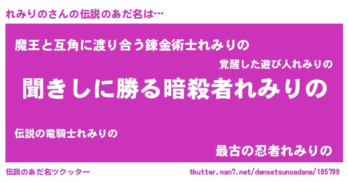 | 男性向けラノベタイトル風あだ名 | 『れみりのという概念が存在しない退屈な世界 』 |