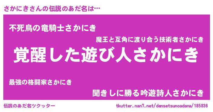 | 男性向けラノベタイトル風あだ名 | 『さかにき~年齢イコール彼女いない歴の魔法使い~』 |
