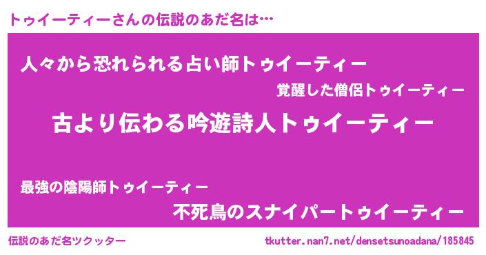 | ヘコむあだ名 | 『トゥイーティー(小並感)』『トゥにー』 |