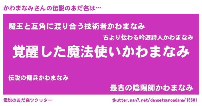| 男性向けラノベタイトル風あだ名 | 『かわまなみの嫁は女の子じゃないと思った?』 |