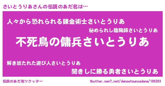 | ヘコむあだ名 | 『さいにゅー』『さいとうりあ(遠い目)』 |