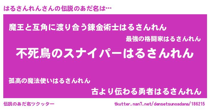| 男性向けラノベタイトル風あだ名 | 『ハルサンレンアートオンライン』 |