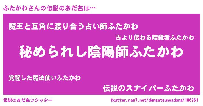 | 女子向けラノベタイトル風あだ名 | 『ふたかわなんてお断りですっ。』 |