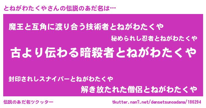 | 胡散臭い通販商品みたいなあだ名 | 『来世でも幸せになれる健康食品…その名も「とねがわたくや」』 |