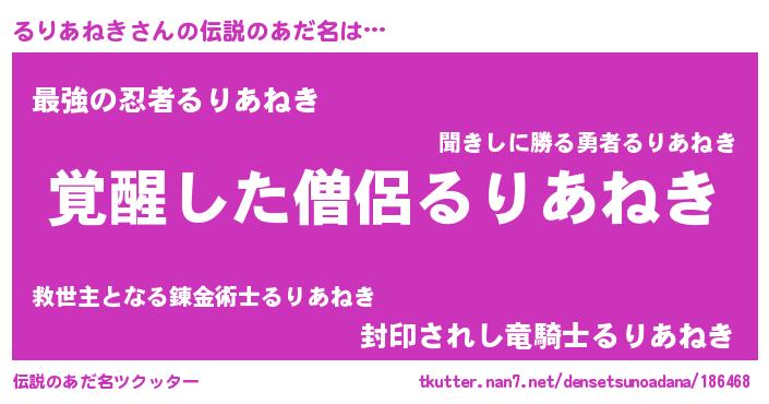 | 意味不明あだ名 | 『とにかく怪しいるりあねき』 |