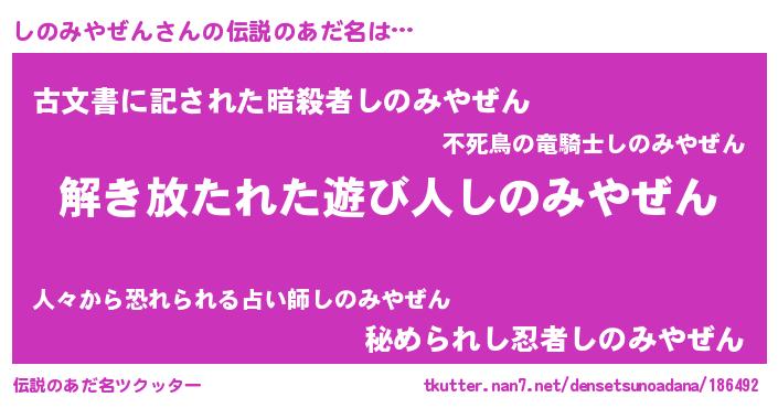 | 意味不明あだ名 | 『とにかく怪しいしのみやぜん』 |