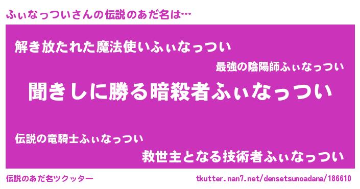 | 男性向けラノベタイトル風あだ名 | 『ふぃなっついという概念が存在しない退屈な世界 』 |