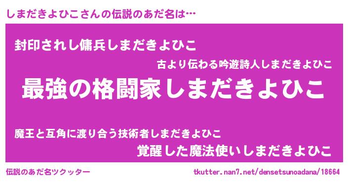 | 男性向けラノベタイトル風あだ名 | 『しまだきよひこ~年齢イコール彼女いない歴の魔法使い~』 |