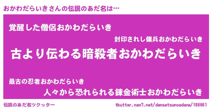 | 女子向けラノベタイトル風あだ名 | 『おかわだらいきアンティーク』 |
