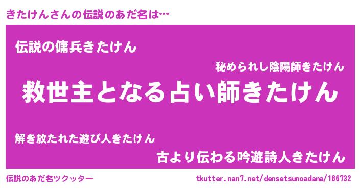 | 男性向けラノベタイトル風あだ名 | 『うちのきたけんが世界を掌握している!』 |