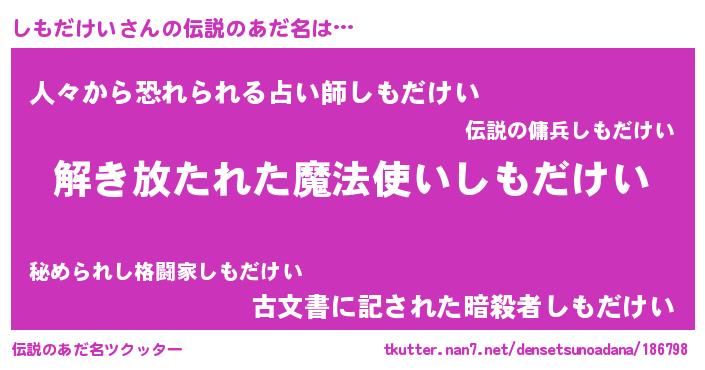 | ヒーロー風カッコイイあだ名 | 『幻影騎士シモ』『正義の使者しもだけい』 |