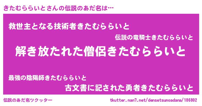 | 男性向けラノベタイトル風あだ名 | 『きたむららいとの嫁は女の子じゃないと思った?』 |