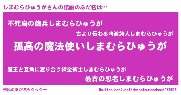 | 男性向けラノベタイトル風あだ名 | 『魔弾の王としまむらひゅうが』 |