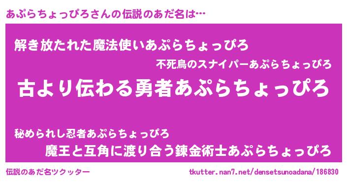 | ヘコむあだ名 | 『あぷらちょっぴろ(遠い目)』『あぷっぺ』 |