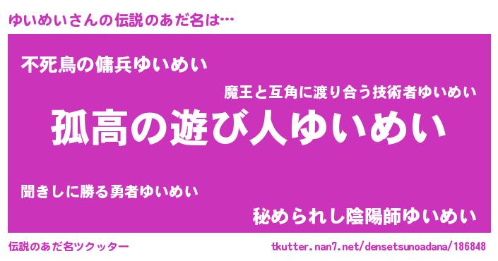 | 男性向けラノベタイトル風あだ名 | 『緋弾のユイメイ』『魔弾の王とゆいめい』 |