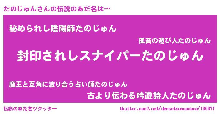 | 男性向けラノベタイトル風あだ名 | 『たのじゅん~年齢イコール彼女いない歴の魔法使い~』 |