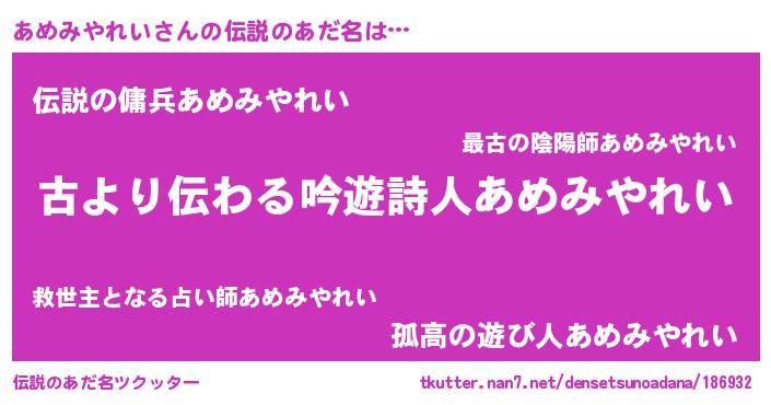 | ヘコむあだ名 | 『あめみやれい(小並感)』『あめにゅー』 |
